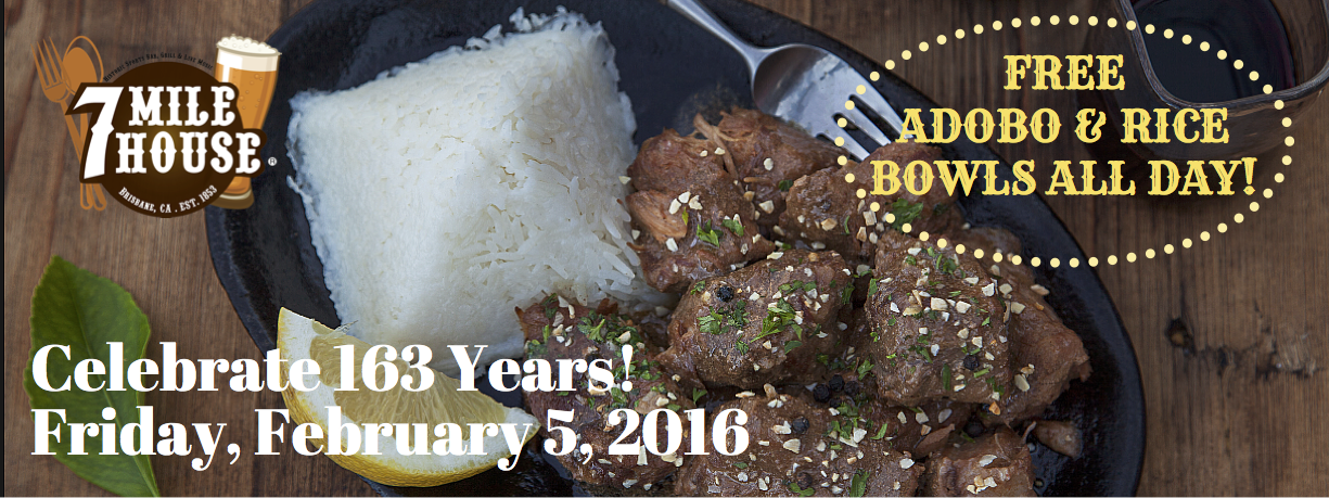 Friday, February 5, 2016, 11:30am, “Adobo and Rice Giveaway”- The festivities kick off as 7 Mile House serves their famous adobo and rice bowls for free all day long (while supplies last) as local band R&B band, 'LP', jams into the evening!
